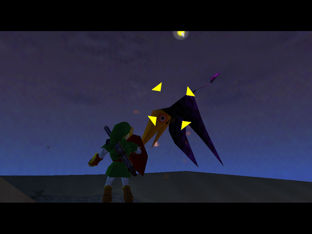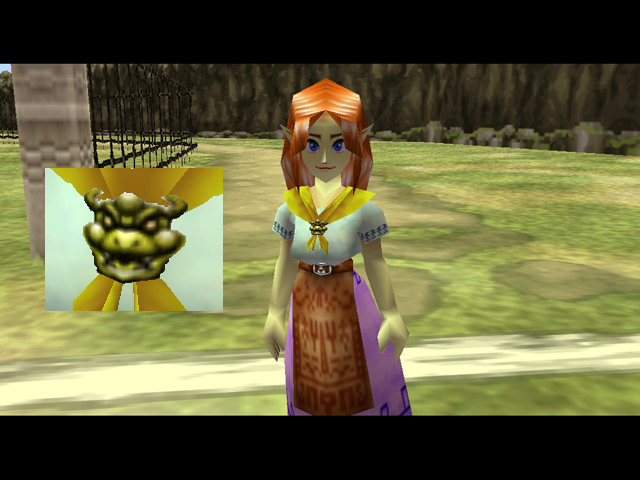There are a few appearances by Mario characters in Ocarina of Time. The first is found in the Castle Courtyard, where the window on the right has portraits of various Mario characters inside. The second is the ranch girl Malon's brooch, which resembles the face of Mario's foe, Bowser.