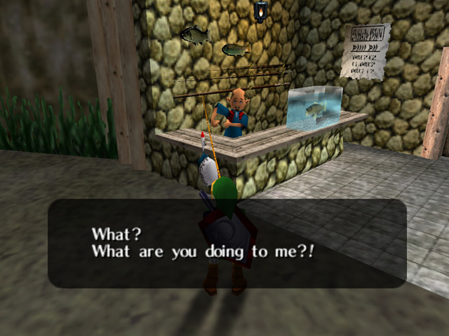 As an adult, cast towards the fisherman and you can snag his hat. If you cast his hat into the water, he'll fine you 50 rupees and never wear the hat again.