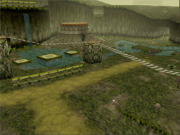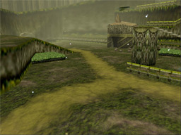 You’ll want to obtain the Kokiri Sword first. Proceed past Link’s house and walk up the slope to the left. You’ll find a small maze of fences directly ahead. Walk through them and approach the hole in the wall in the back.