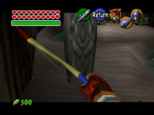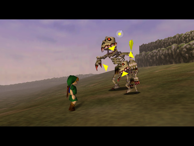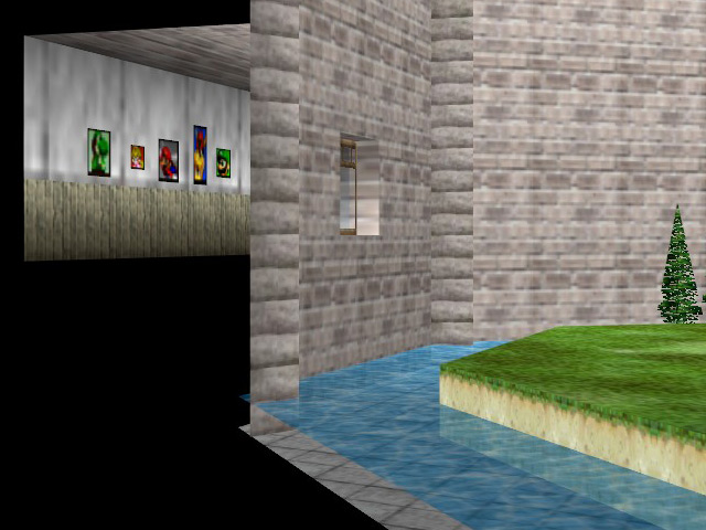 There are a few appearances by Mario characters in Ocarina of Time. The first is found in the Castle Courtyard, where the window on the right has portraits of various Mario characters inside. The second is the ranch girl Malon's brooch, which resembles the face of Mario's foe, Bowser.