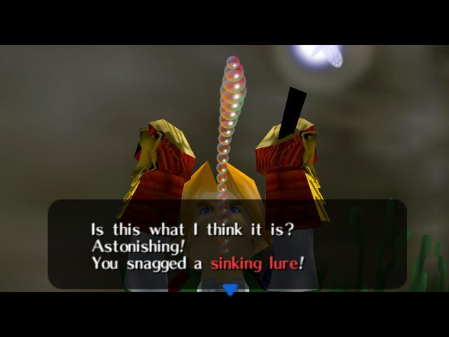 The sinking lure is an illegal lure that makes catching bottom-dwelling fish dramatically easier. It is found in random locations around the rocks in the pond and along the stream. You won't be able to see it on the ground, so you'll have to do some searching around. Unfortunately, the fisherman will not reward you for anything you catch with the sinking lure, but he will still count record-breaking catches.